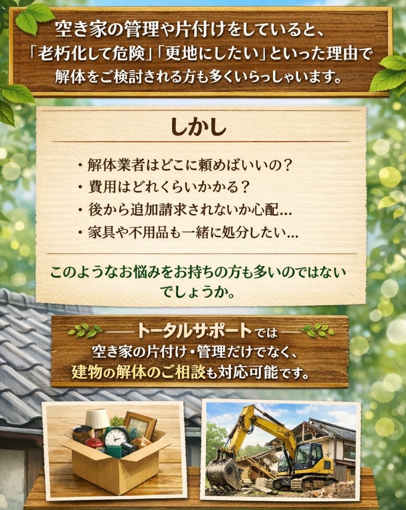 トータルサポートでは空き家の片付け・管理だけでなく、建物の解体のご相談も対応可能です。空き家の中に残っている家具や不用品の片付けから解体後の更地整理まで、まとめてお任せいただけます。安心してご相談ください。